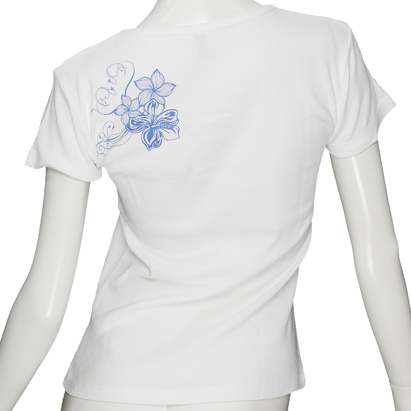 ハイビスカス&プルメリア柄 6.2oz フライス 半袖 Tシャツ 白地 青 プリント [TSR018-1-1]