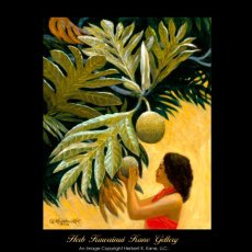 ウル(パンの実)を収穫する女性を描写したハーブ・カネ氏の絵画のジクレー版画になります。
