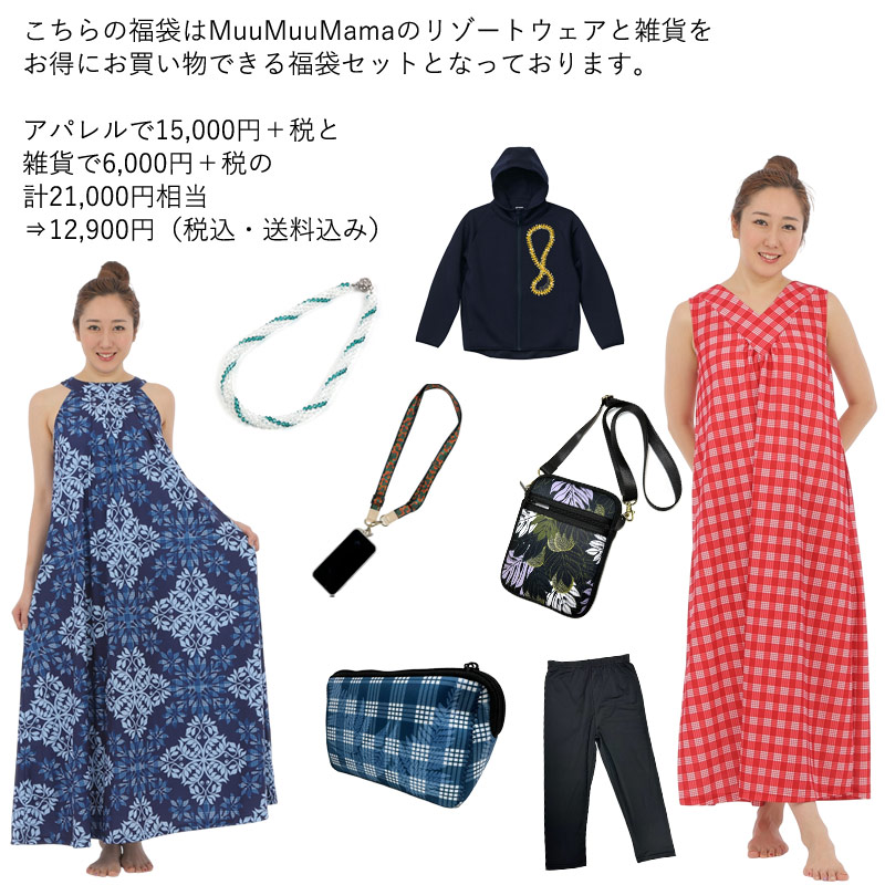 福袋 カジュアルセットです。リゾートウェアで15,000円相当、雑貨で6,000円相当の合計23,100円(税込み)相当の商品が12,900円[税込・送料込]と、お得な福袋になっております!