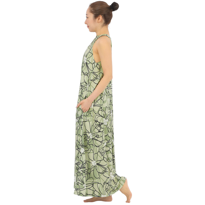ナウパカプリント柄生地 フラダンス 舞台衣装 ラウンドネック ロングドレス ポケット付き Naupaka柄