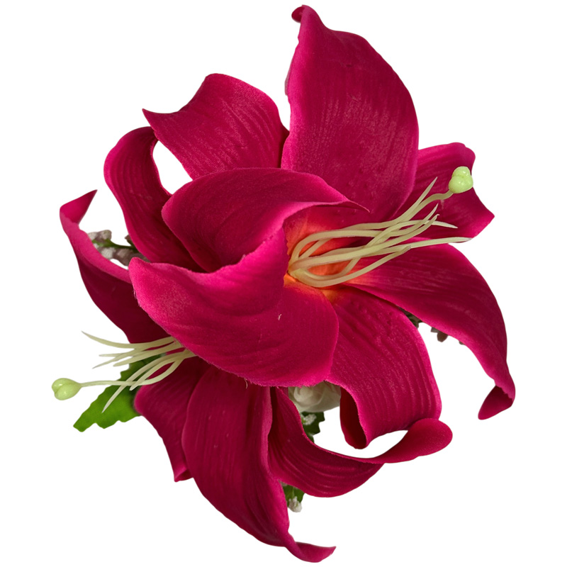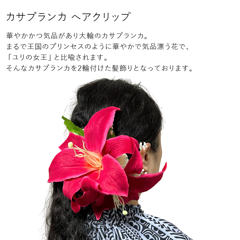 シルクフラワー素材使用のカサブランカ・ヘアクリップです。カサブランカが二つと両サイドにロケラニがあしらわれている、まるで本物のように丁寧に製作されており、舞台映えのするヘアクリップとなっております。