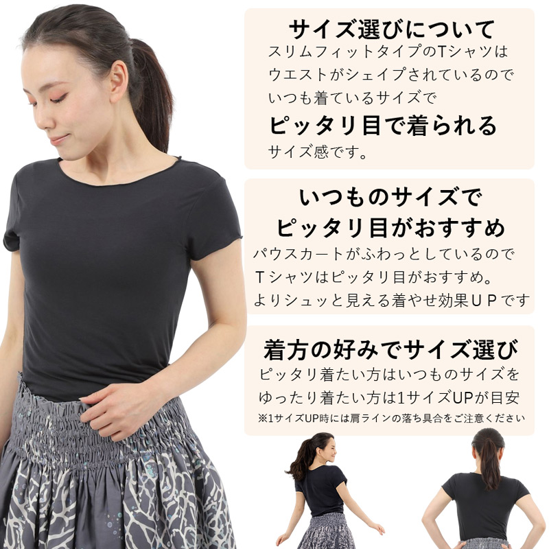 特徴 | ・よりフィット感のあるショートスリーブTシャツ ・サラッとテロンとした生地感で着心地抜群 ・糸からこだわったオリジナルTシャツ ・パウスカートから裾が出ないよう長めの身丈 ・切りっぱなし風のデザインが可愛い! ・ウエストラインがくびれているので、普段のサイズでピッタリ目になります。 |